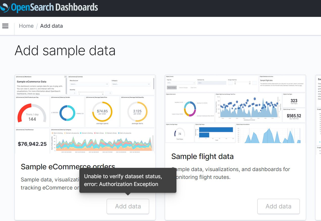 I am having opensearch running on docker container. Whenever I am logged in as normal user(non-admin), I don’t get an option to add sample data on the opensearch dashboard.